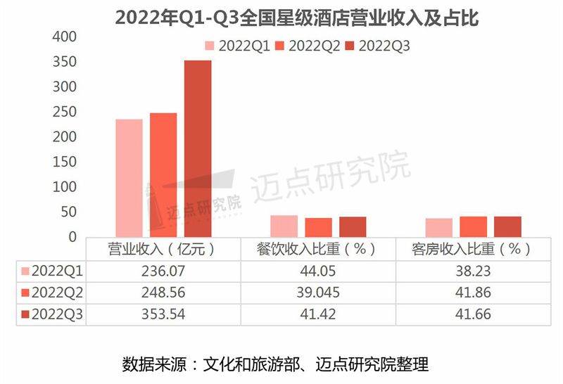 第三季度全国星级酒店营收收入总计353.5亿元,其中餐饮收入占比41.42%,客房收入占比41.66%。三季度为传统的酒店住宿需求旺季,营业收入增长明显,相较于二季度增加104.98亿元,环比增幅达42.24%。同比层面,与2021年第三季度(353.91亿元)相比,有极小幅度下降。