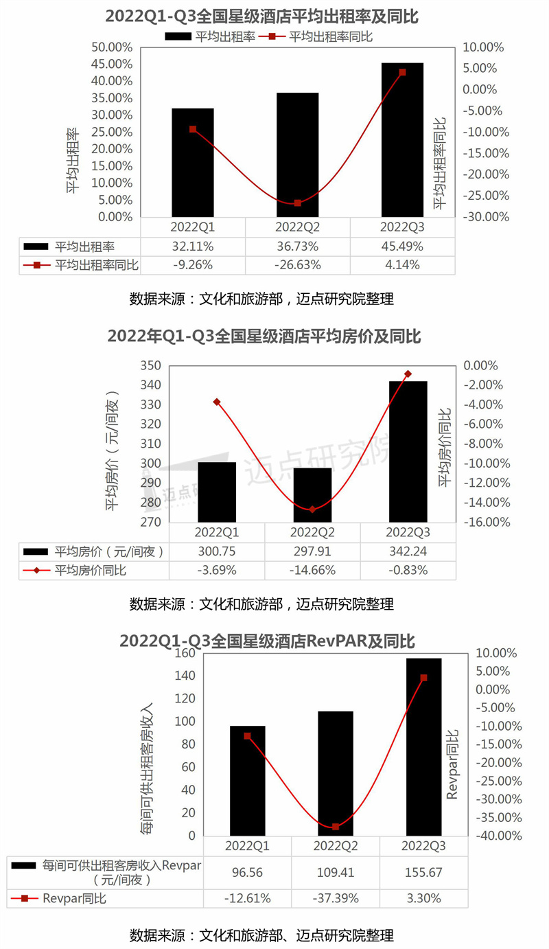 2022年三季度,受疫情反复持续影响,酒旅行业处于震荡不稳定发展状态。据文化和旅游部公布的全国星级酒店经营情况数据:第三季度,共有6505家星级酒店数据通过审核,营业总收入353.54亿元,其中餐饮收入占41.42%,客房收入占41.66%。星级酒店平均房价342.24元/间夜,同比下降0.81%;平均出租率45.49%,同比上升4.14%;每间可供出租客房收入RevPAR 为155.67元/间夜,同比增长3.3%。环比层面,在暑期传统旅游旺季的积极带动下,Q3各经营指标均有所恢复,平均房价环比增幅为14.88%,平均出租率环比增长8.76%,RevPAR环比增幅明显且具体为42.28%。