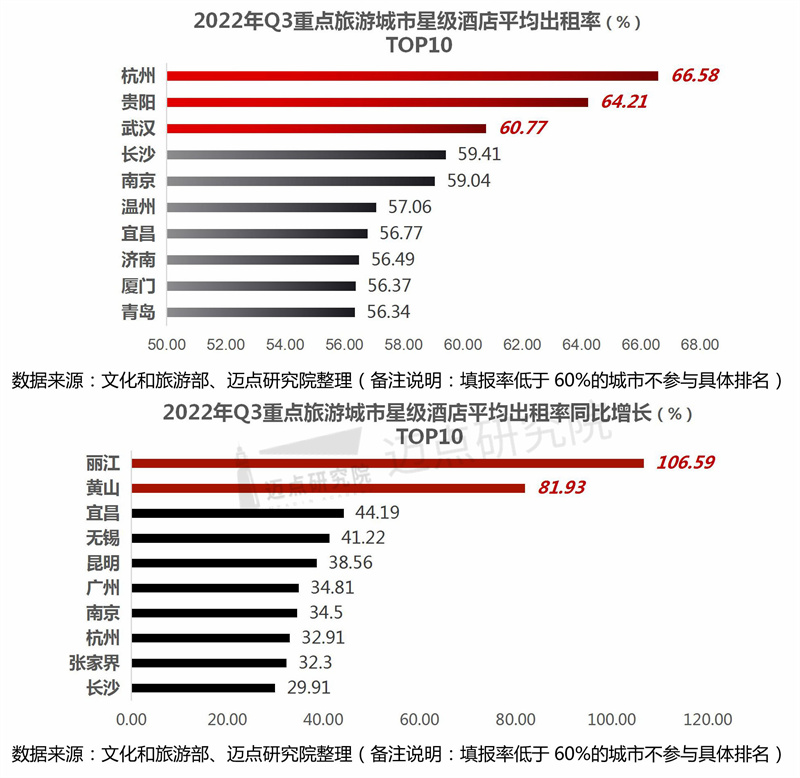 50个重点旅游城市星级酒店平均出租率同比方面,34个城市星级酒店平均出租率同比为正增长,其余16个城市为负增长。同比增长前十名的城市依次为丽江、黄山、宜昌、无锡、昆明、广州、南京、杭州、张家界和长沙。丽江以106.59%的同比增长水平位列全国第一,其星级酒店平均出租率已小幅赶超2021年同期。