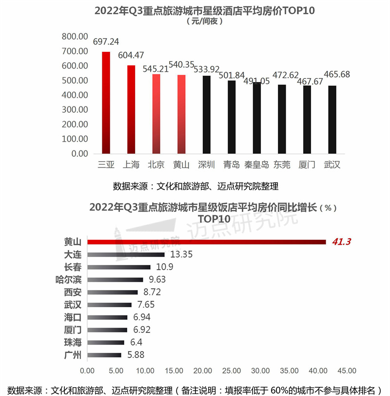 50个重点旅游城市平均房价同比方面,23个城市同比为正增长,其余27个为负增长。同比增长前十名的城市依次为黄山、大连、长春、哈尔滨、西安、武汉、海口、厦门、珠海、广州,其中黄山市星级酒店平均房价同比增长涨幅最大,为41.3%,远超于其他城市。