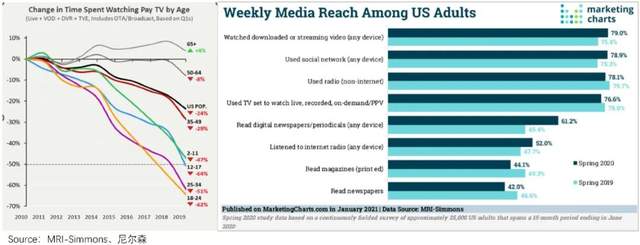 同时,数据显示,2019-2020年,美国流媒体触达占比排在首位,且是增长态势;与之相反,有线电视的触达占比是下降的。