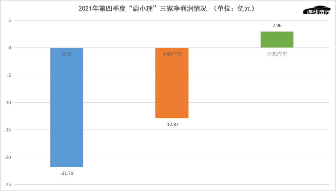 2021年第四季度“蔚小理”三家净利润情况,数据来源于公开数据,连线出行制图