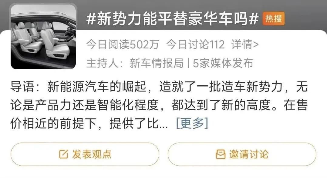 - “新势力能平替豪华车吗”词条登上热搜,截图自微博*
