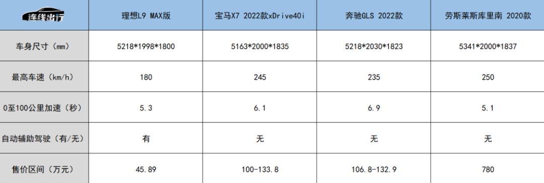 理想L9与宝马X7、奔驰GLS以及劳斯莱斯库里南参数对比,数据来源于汽车之家,连线出行制图