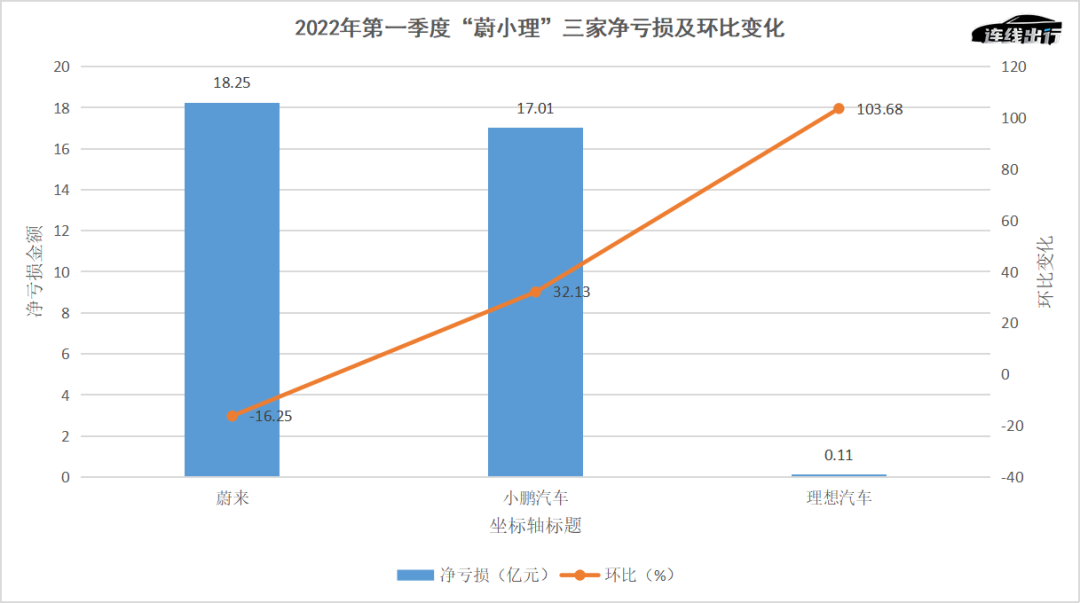 2022年第一季度“蔚小理”三家净亏损及环比变化,数据来源于公开资料,连线出行制图