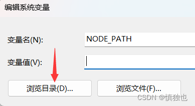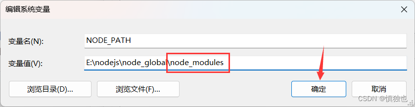 变量名称输入NODE_PATH,然后点击浏览目录,找到刚刚新建的node_global文件夹,选中后点击确定,然后在变量值后添加\node_modules,最后点击确定。
