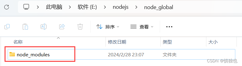 操作完成后你会发现原本原本的node_global文件夹中新增了一个node_modules的文件夹;如果没有自动新建的话就手动新建一个node_modules文件夹。