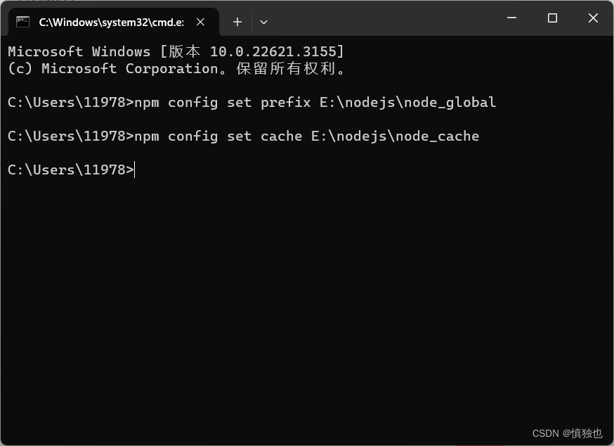 npm config set prefix ..\nodejs\node_global(npm config set prefix 刚刚创建的node_global文件夹的路径)