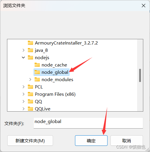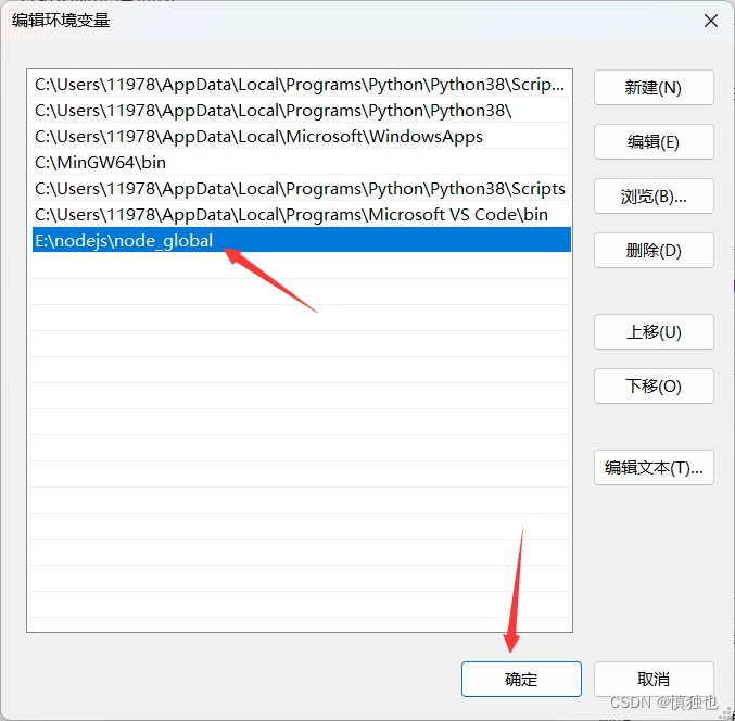 点击Path中原本的..\AppData\Roaming\npm,然后点击右侧的浏览并找到之前创建的node_global文件夹,选中后点击确定,将其更改为node_global文件夹的路径,然后点击确定。