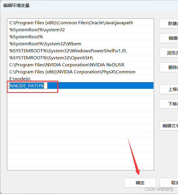 接着再修改系统变量中的Path,找到系统变量中的Path变量,双击,在弹出的窗口中的空白行中双击输入 %NODE_PATH% ,然后点击一路点击确定,保存并退出环境变量设置窗口。