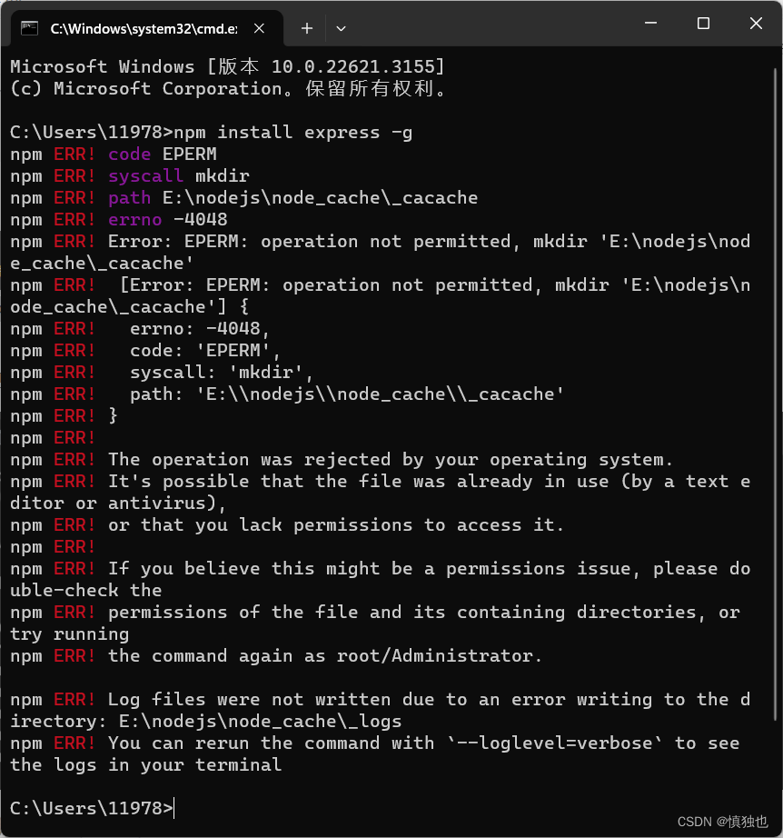 如果出现以下错误(...operation not permitted...),系因没有以管理员身份运行命令行窗口(cmd),可参照前文方法重新以管理员身份运行命令行窗口。