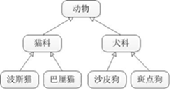 在现实生活中,继承一般指的是子女继承父辈的财产。在程序中,继承描述的是事物之间的所属关系,通过继承可以使多种事物之间形成一种关系体系。例如猫和狗都属于动物,程序中便可以描述为猫和狗继承自动物,同理,波斯猫和巴厘猫继承自猫,而沙皮狗和斑点狗继承自狗。这些动物之间会形成一个继承体系,具体如下图所示。