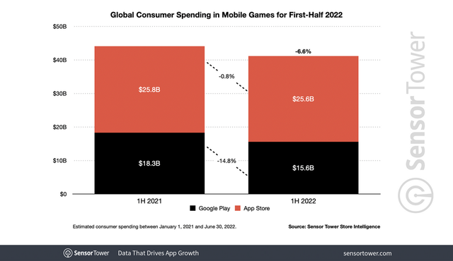 在分析师看来,这和游戏市场全球大环境有一定关系。Sensor Tower最新报告显示,2022上半年全球手游收入412亿美元(约人民币2787亿元),同比下降6.6%。