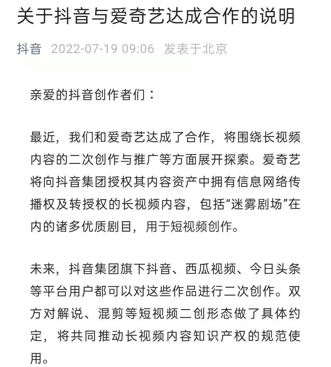 7月19日上午,抖音与爱奇艺同时发布公告称,将围绕长视频内容的二次创作与推广等方面展开探索。**爱奇艺将向抖音授权其拥有信息网络传播权及转授权的长视频内容,用于短视频创作。**