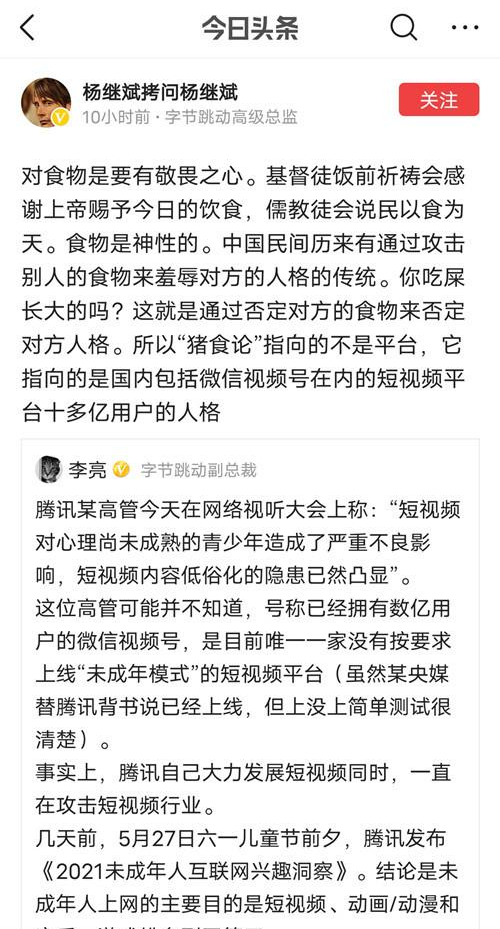 在次日发布的公告中,字节称孙怀忠是在“污名化”短视频行业,极其傲慢且不公允;字节副总裁李亮呛声孙怀忠,称腾讯没有按要求上线未成年模式,且一边攻击行业一边自己大力发展短视频。但有趣的是,字节和李亮均未直接回应版权争议。