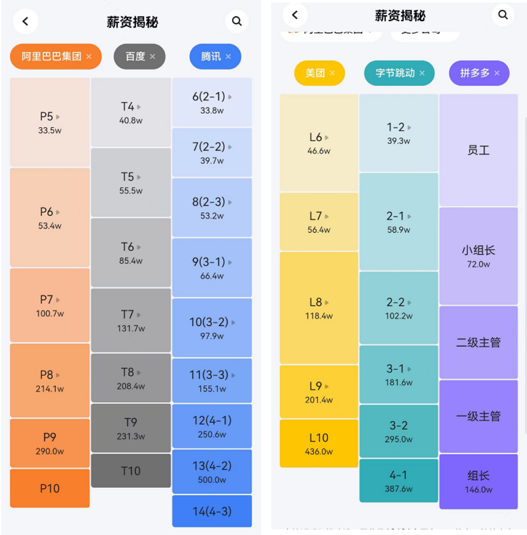 根据脉脉的统计,各大厂各职级大致的薪资中位数如下: