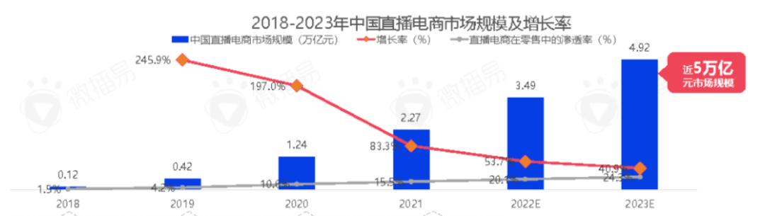 由微播易等机构出品的《2023年中国直播电商机会洞察报告》预计,2023年中国直播电商市场整体规模将达到4.92万亿,增速虽相比往年大大放缓,但仍超过40%。