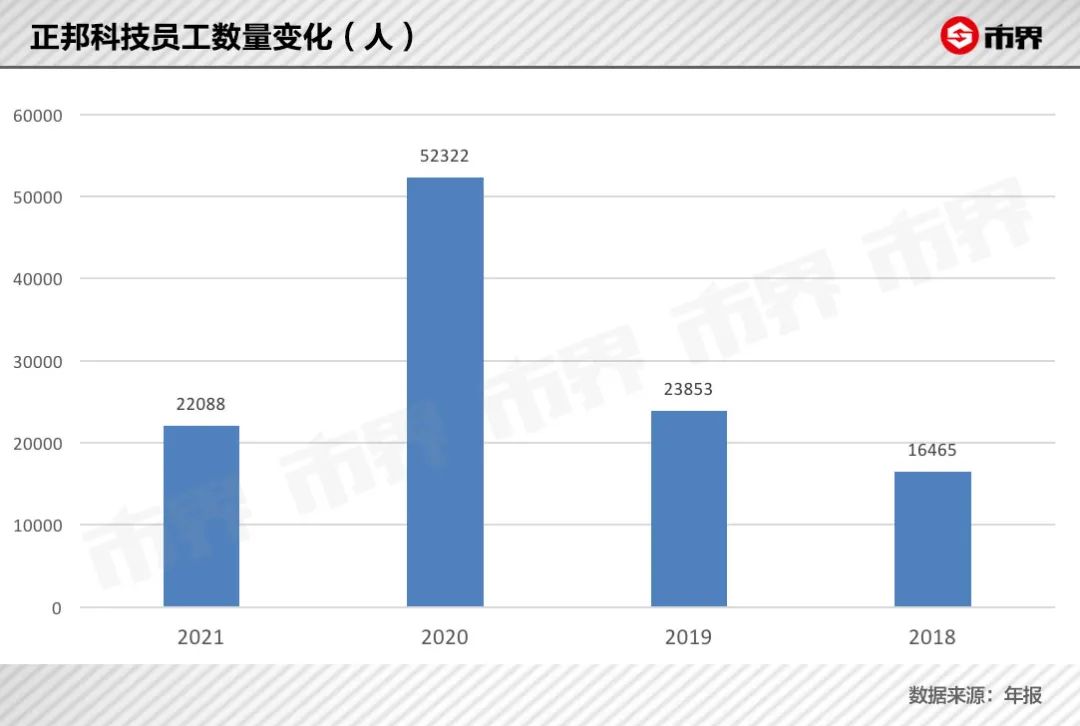 2020年的正邦科技处于扩张的高潮期。这一年,正邦科技的员工数量由上年末的23853人激增到了52322人,几乎相当于在原基础上再建了1.5个正邦科技。