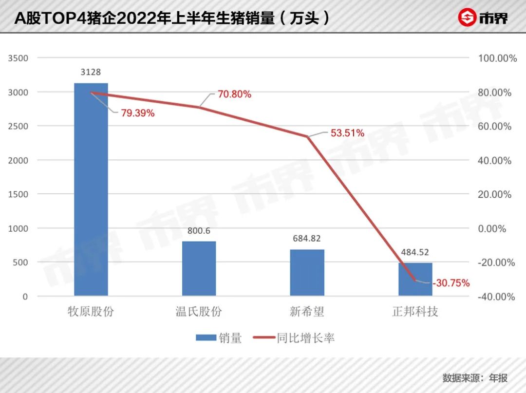 2022年上半年,正邦科技生猪销量大降31%,至484.52万头,排名也从第二掉到了第四,而且是大规模减少。