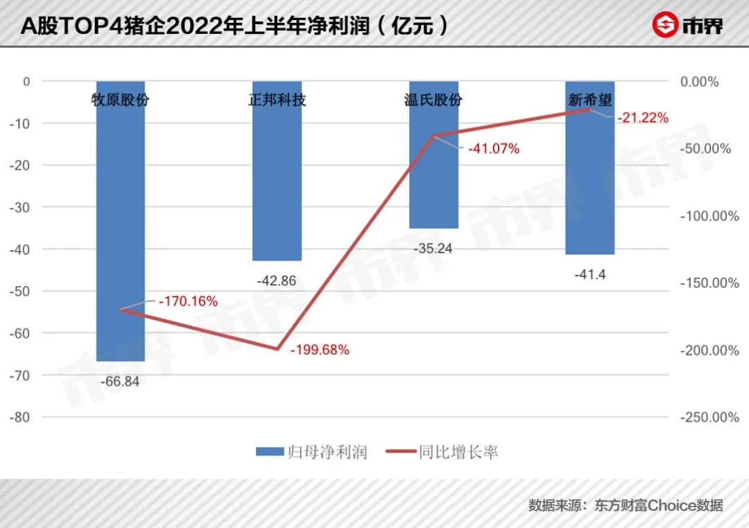 从2021年开始,猪企们又开始为巨亏而挣扎。2022年上半年,A股养猪四巨头——牧原股份、温氏股份、正邦科技、新希望,共亏损了约186亿元。