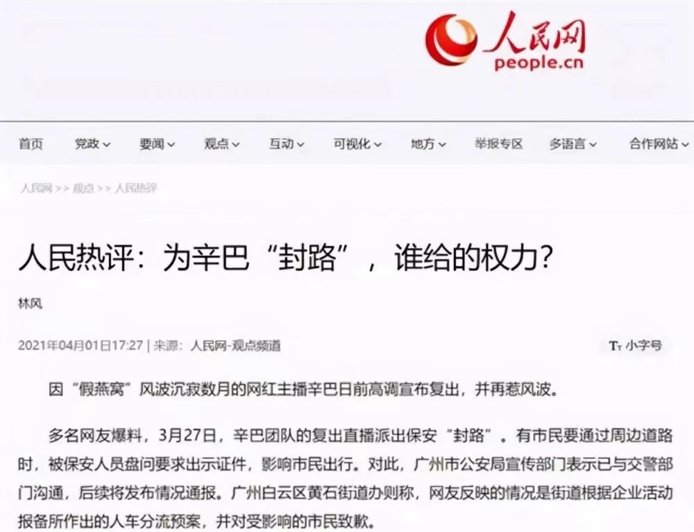 4月1日,人民日报“人民热评”发表提问:为辛巴封路,谁给的权力?还在末尾意味深长地点出:“辛巴,好自为之”。