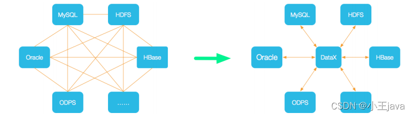 为了解决异构数据源同步问题,DataX将复杂的网状的同步链路变成了星型数据链路,DataX作为中间传输载体负责连接各种数据源,当需要接入一个新的数据源的时候,只需要将数据源对接到DataX,便能跟已有的数据源做到无缝数据同步了!