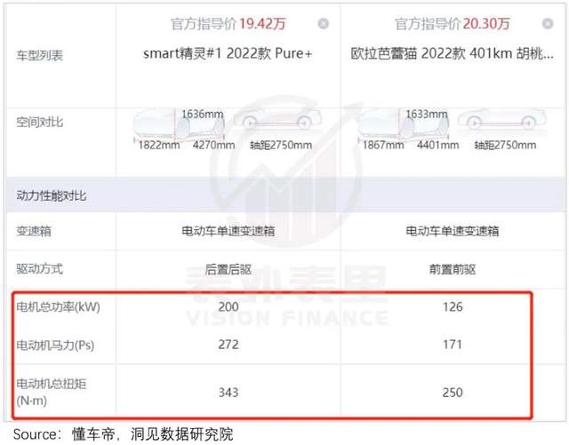 但可以看到,同等价位下,芭蕾猫相比吉利旗下的smart精灵#1,在续航、马力、最高车速等配置上都有不及。