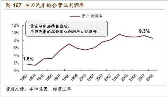 此后,雷克萨斯不仅成为丰田利润最高的部门,也是日本利润最高的出口品牌之一。同时,其在1993-2007年,拉动丰田的营业利润率从1.8%飙升至9.3%。