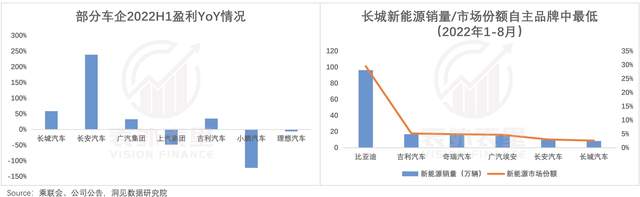 从自主品牌的发展对比看,2022H1,长城汽车在利润增长表现上,是名列前茅的。但在新能源市场份额上,长城却是垫底的。情况类似的还有长安汽车。