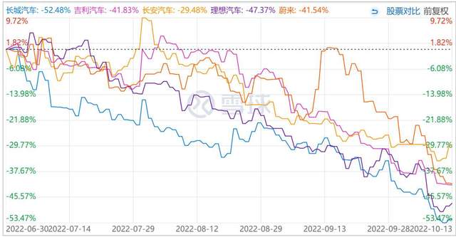 可以看到7月以来的景气度下行周期里,长城反而是跌得最惨的,跌幅近57%。比亏损的理想、蔚来下跌的都多。(小鹏已不是景气度的问题了,就将其剔除了出去,懂的都懂。)