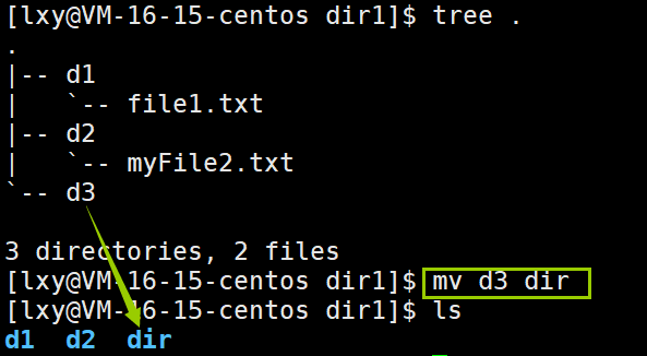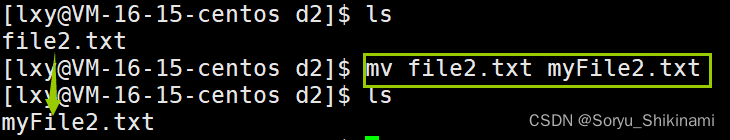 - )当第二个参数类型是文件时,mv命令完成文件重命名,此时,源文件只能有一个(也可以是源目录名),它将所给的源文件或目录重命名为给定的目标文件名。