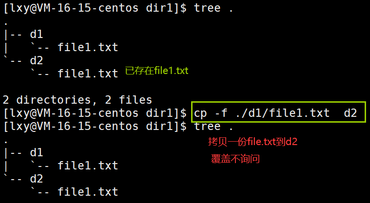 1)-f 或 --force 强行复制文件或目录, 不论目的文件或目录是否已经存在