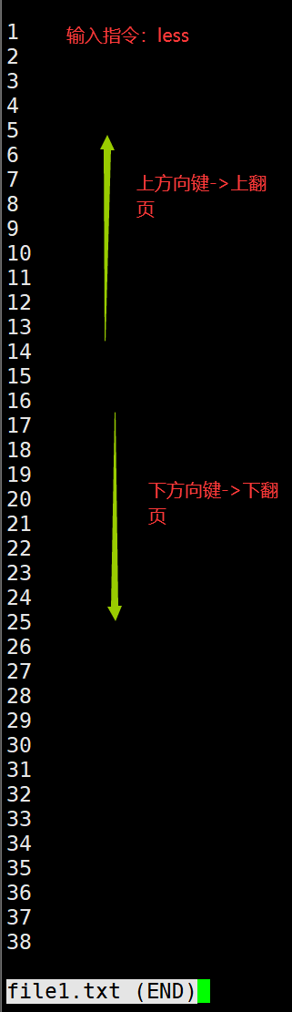 注意: less指令可以通过按上下键进行上翻和下翻操作,并且less指令在查看之前不会加载整个文件。