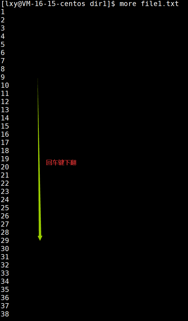注意: more指令只能通过按回车键进行下翻操作,无法进行上翻操作,并且more指令在查看之前会先加载整个文件。