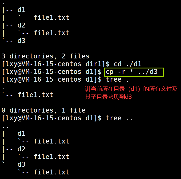 小技巧: 当需要将当前目录的所有内容进行拷贝时,可以用到通配符进行拷贝。