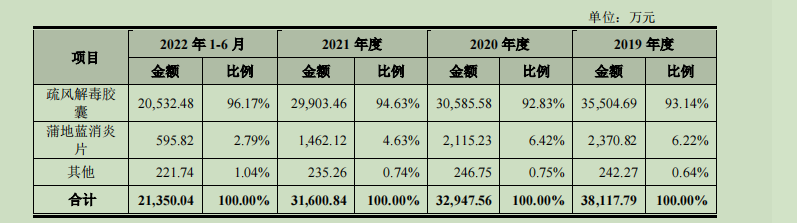 数据显示,报告期内济人药业疏风解毒胶囊在中成药的销售占比分别为93.14%、92.83%、94.63%和96.17%。