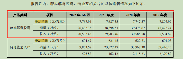 通过梳理招股书发现,济人药业利润下滑的原因与疏风解毒胶囊量价齐跌不无关系。数据显示,2019年公司疏风解毒胶囊平均单价为7807.99元/万粒,当年总销量约4.55亿粒,合计销售收入达到3.55亿元。到了2021年,该产品的平均单价降至7687.55 元/万粒,销量约3.89亿粒,收入不到3亿元。
