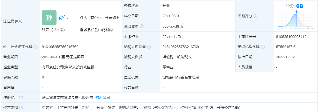 天眼查显示,中澄城县质胜中药材商贸有限公司成立于2011年,位于陕西省渭南市,是一家以从事零售业为主的企业。企业注册资本800万,实缴资本仅有50万,员工规模不清楚,该公司连续多年的社保缴纳记录为0。空壳公司?如何撑起高达近千万元采购合同?