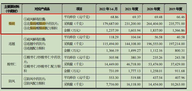 招股书显示,济人药业的主要原材料(中药材)包括柴胡、连翘、酸枣仁、防风、山慈菇,其中柴胡对应的产成品为疏风解毒胶囊、北柴胡/醋柴胡中药饮片、北柴胡/醋柴胡配方颗粒。报告期内,济人药业柴胡采购金额分别为1566.86万元、1837万元、1603.94万元、1237.39万元。