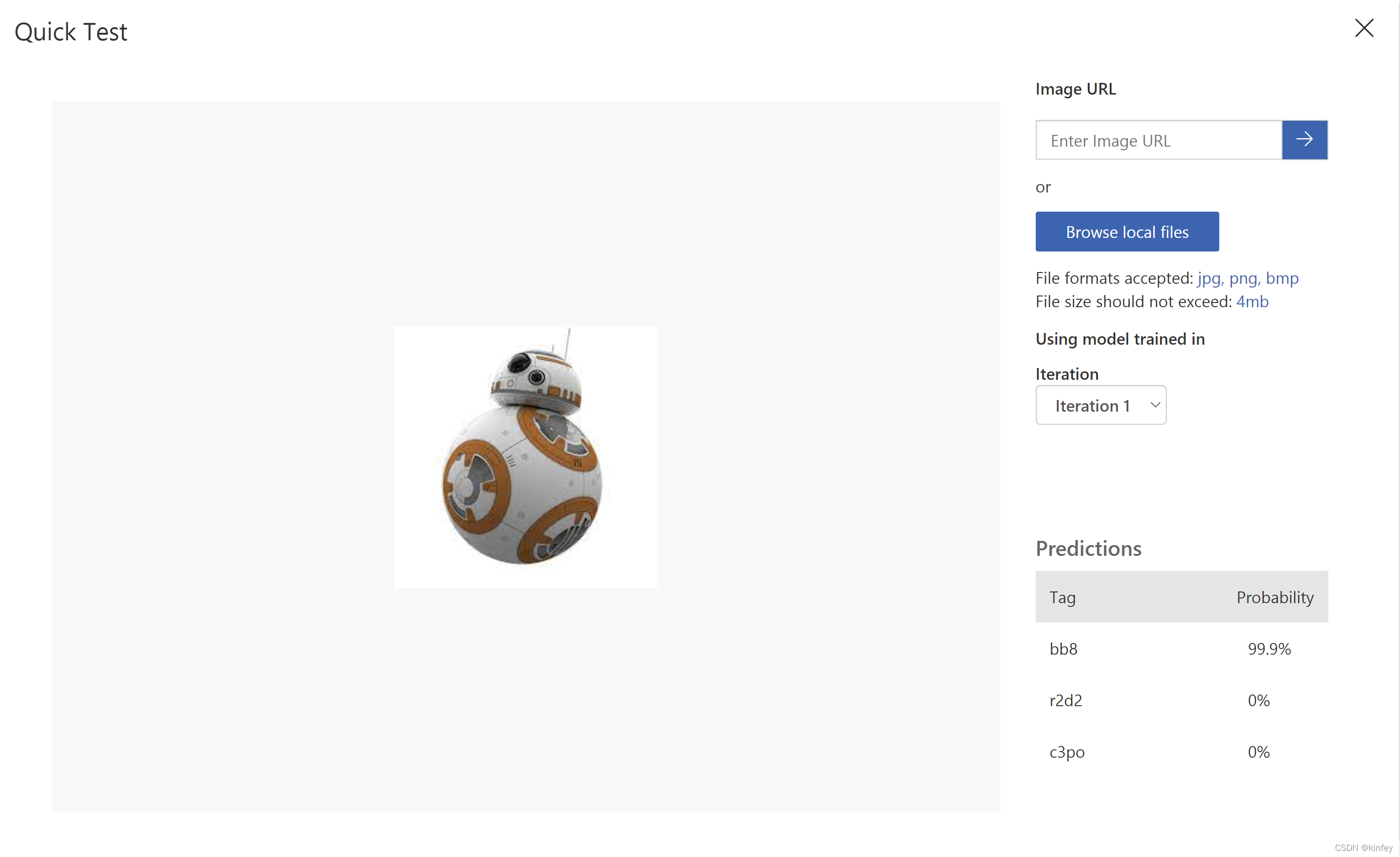 自定义视觉支持图像分类和物体识别,你可以根据自己的需要选择,这里选择图像分类(Classification) 选择识别多类型单标签(Single tag per image) 建议选择General(compact),这个选项支持多种模型类型的导出,如TensorFlow, ONNX, CoreML 适应部署到不同终端,和云端应用。 - 创建成功后,进入后创建 BB8 , C3PO , R2D2 三个文件夹, 并基于你找到的图片对应上传到对应的文件夹中