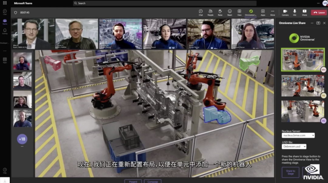 此外,黄仁勋还特别指出,宝马正在使用Omniverse规划全球近30家工厂的运营。在每座工厂实际开业两年之前,他们会模拟完整建造一间电动汽车工厂,并不断进行调整优化。