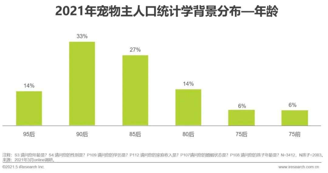 细观当下正快速崛起的宠物经济,艾瑞咨询发布的《2021年中国宠物消费趋势白皮书》显示,按照年龄段划分,宠物主人中90后、95后群体占比合计为47%。而在城市区域分布上,一线新一线和二线为代表的高线城市家庭养宠渗透率更高。