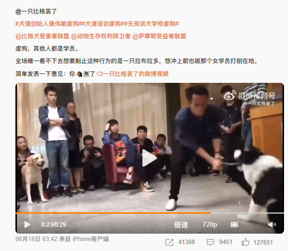 近期,有宠物博主转发了一条“训犬”视频。视频中,一位“训犬师”在示范训狗,期间采用了脚踹、抡摔等极端操作,被质疑表面训犬实为虐狗。此人正是犬道文化校长唐伟敏,其创办的犬道文化在全国多地拥有训犬基地,抖音粉丝超243万。