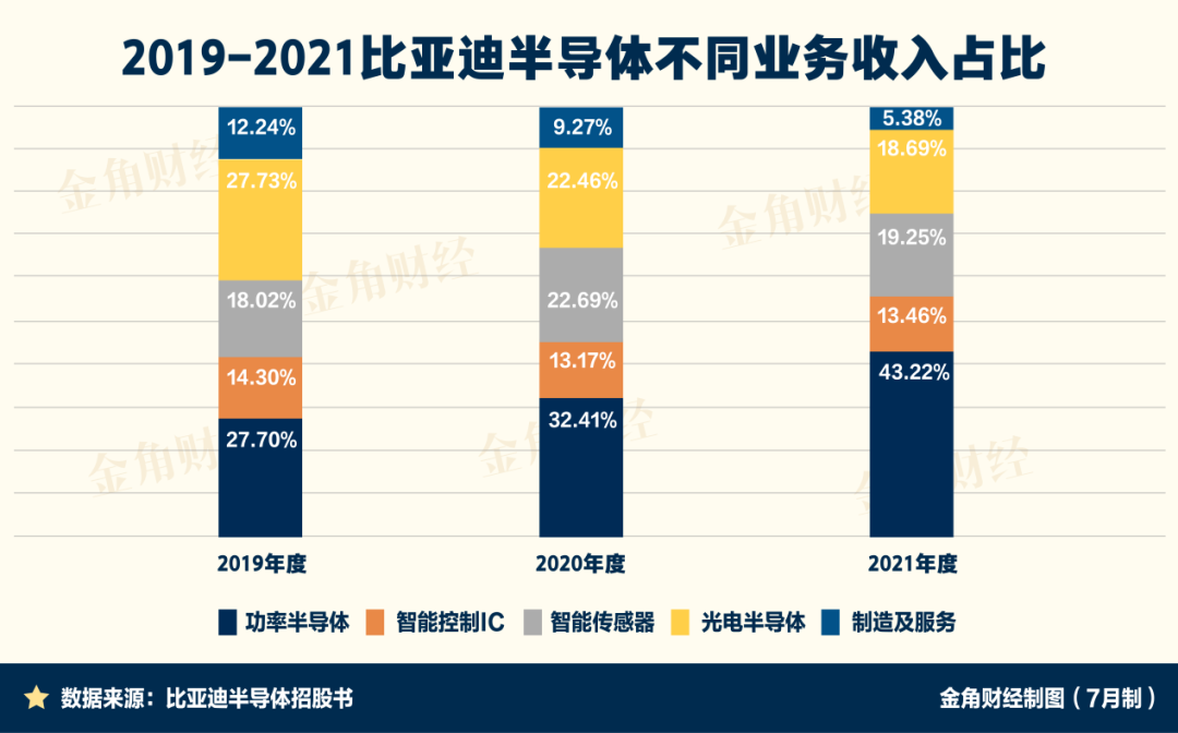 招股书透露,目前比亚迪半导体主要业务分为功率半导体、智能控制 IC、智能传感器及光电半导体四大块,其中功率半导体在营收中的占比超过3成,是比亚迪半导体最重要的收入来源。