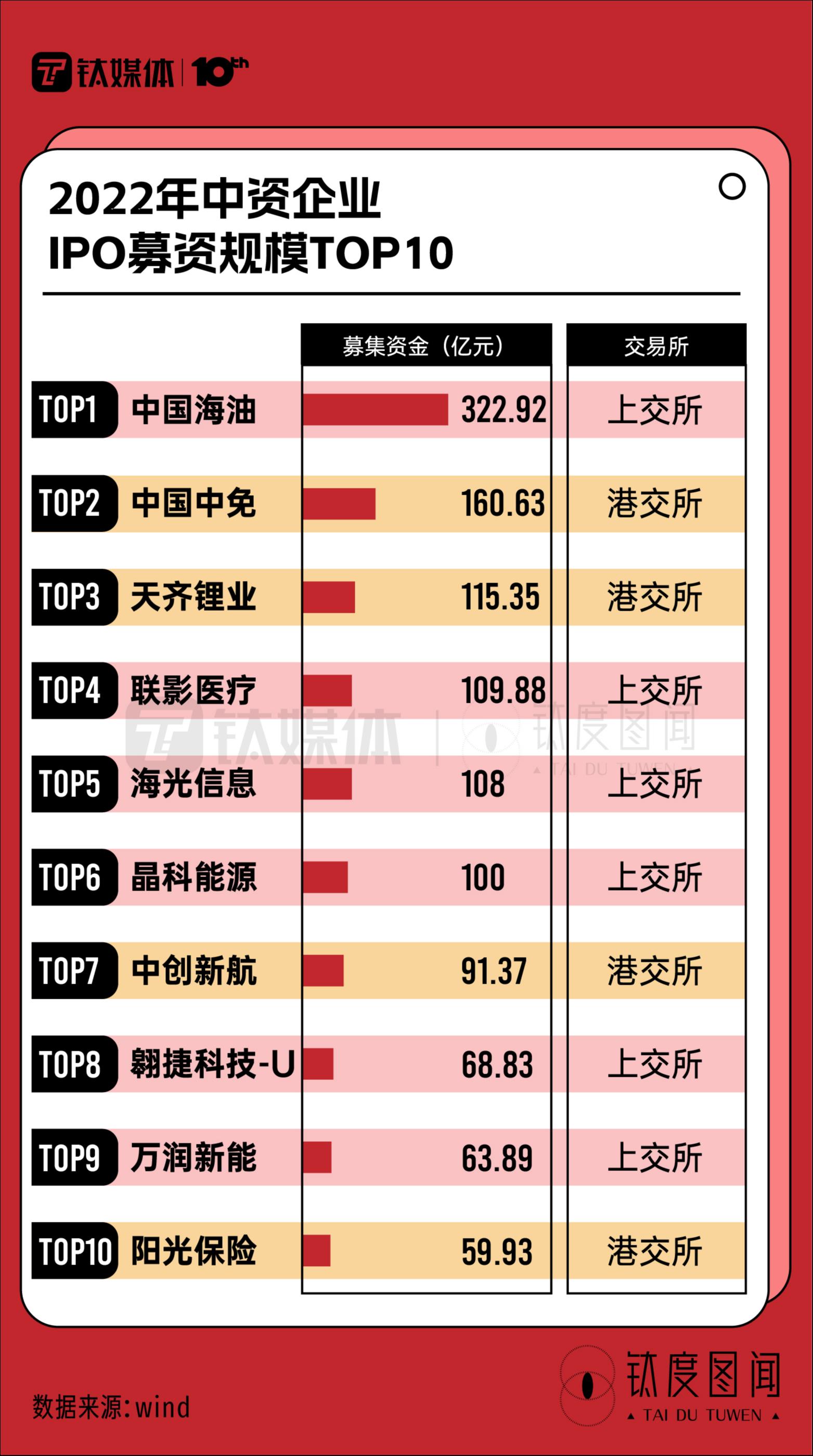 从企业情况看,有6家企业的募集规模达到了百亿元以上,“中字头”企业募资规模较大。其中,在上交所上市的中国海油以323亿元的募集资金成为中资企业“募资王”,在港交所上市的中国中免和天齐锂业两家企业排名第二、第三。