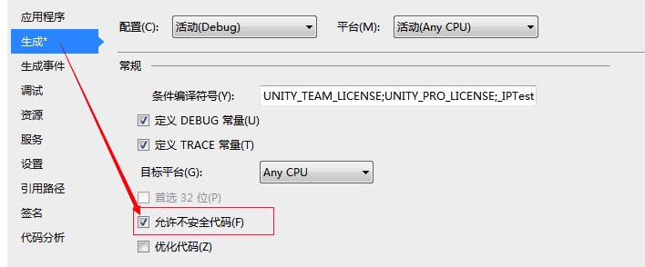 - 2.在项目属性界面中找到 "生成" 选项卡。- 3.在 "生成" 选项卡中找到 **"允许不安全代码"**,勾选该项。