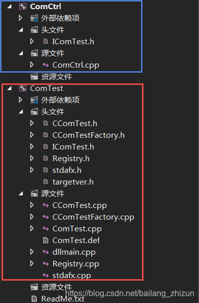 代码结构主要分为两部分,其中 ComTest 为组件程序部分,ComCtrl 为客户部分(即组件的使用者),具体如下所示: