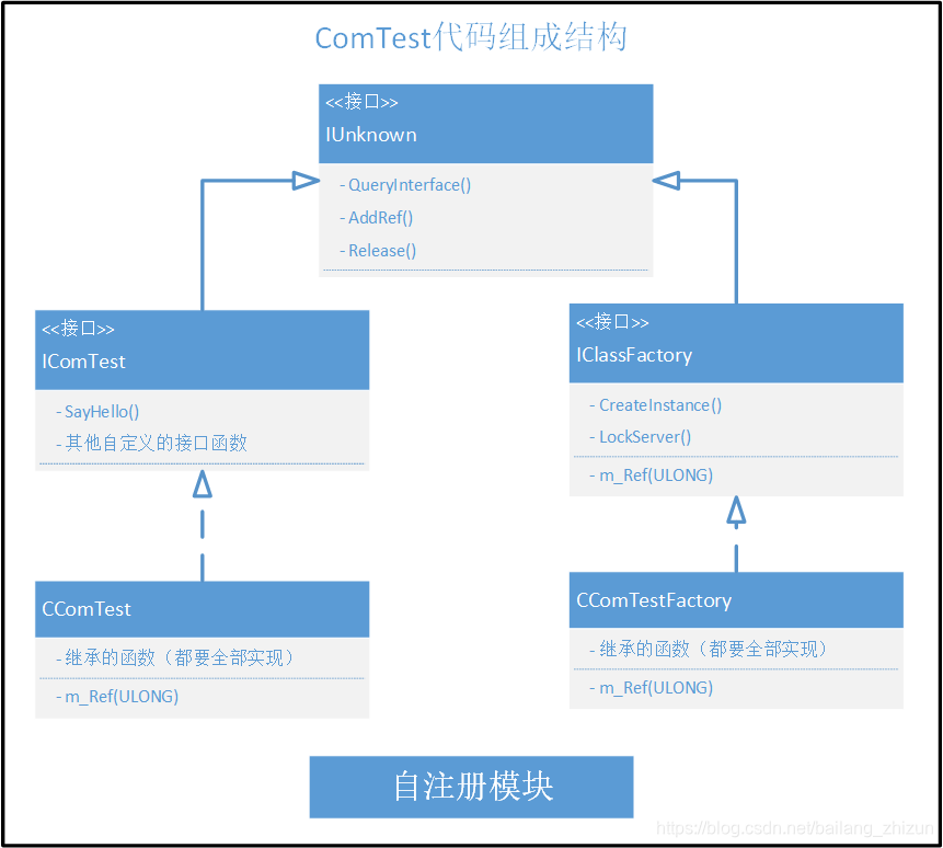 - CComTestFactory 为类厂类,用于生产CComTest对象;
