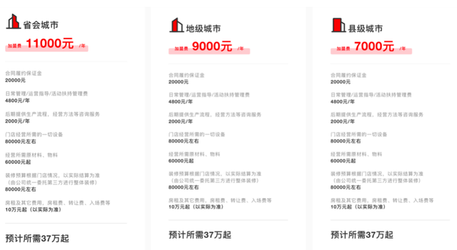 蜜雪冰城官网显示,省会城市、地级城市、县级城市加盟费分别为1.1万元/年、9000元/年和7000元/年,加之需要付给企业的咨询费、购置设备和原材料费用以及装修等,加盟费用预计在37万元起。