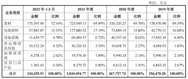 截止2022年Q1,蜜雪销售食材和包装材料收入分别为17.56亿元和3.78亿元,仅这两项销售就贡献了蜜雪收入的近9成。